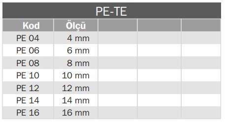 Düşürücü TE (PGE) Pnömatik Rakor Farklı ölçülü pnömatik hortumları bir birine bağlamaya yarayan ara ek te nipellerdir. Pnömatik rakorlar genellikle bir ekipmandan hortuma bağlandığı gibi hortumdan hortuma da bağlanabilmektedir.