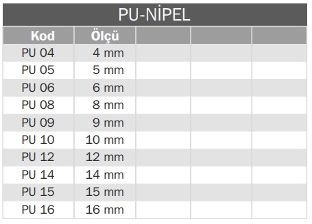 Pnömatik Nipel (PU) Rekor Aynı ölçülü pnömatik hortumları bir birine bağlamaya yarayan nipellerdir. Pnömatik rakorlar genellikle bir ekipmandan hortuma bağlandığı gibi hortumdan hortuma da bağlanabilmektedir.